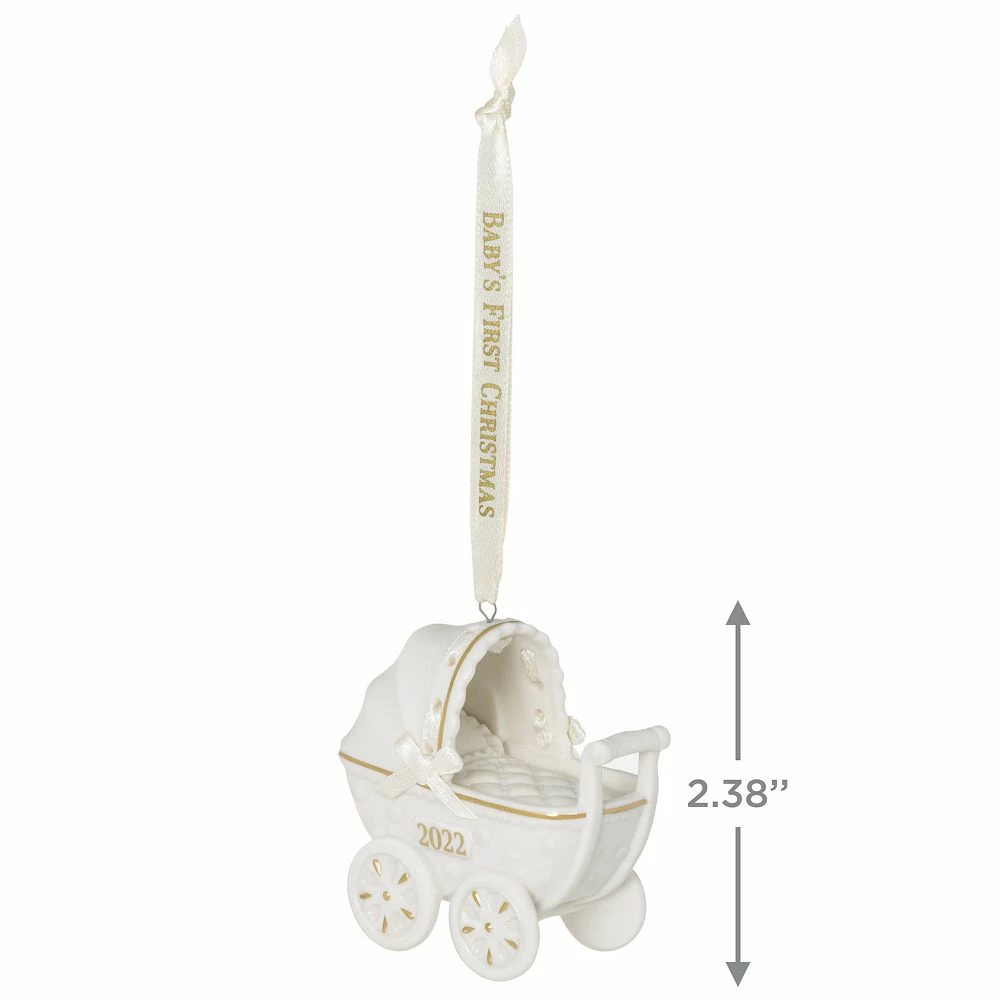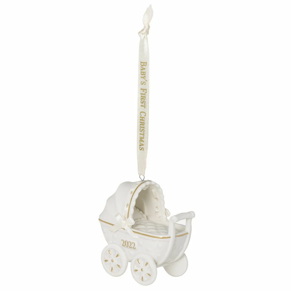 You’ll always remember your baby’s first Christmas! This sweet Christmas tree ornament features a porcelain baby carriage embellished with metallic gold accents and “2022”.